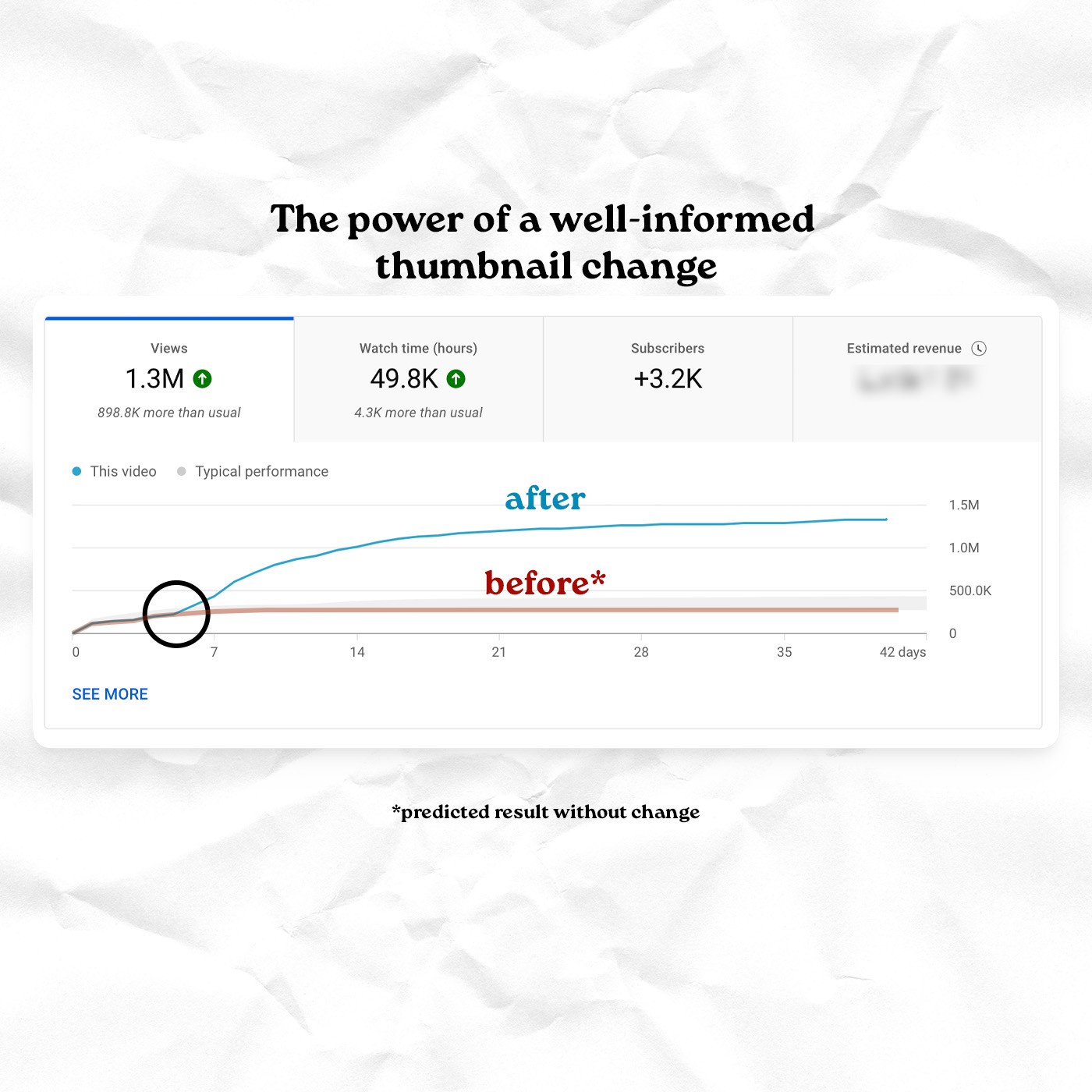 I support you in creating the best titles and thumbnails for your content, leveraging A/B testing to learn what works best for your audience.
